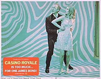 1. Casino Royale (1967) - Pretty much the whole damned thing, but at least the last two-thirds. [Production design: Michael Stringer; Art Direction: Ivor Beddoes, Lionel Couch, John Howell; Visual Effects (matte painting): Les Bowie] If you're not a fan of Casino Royale, (David of Permission to Kill), I suggest that you stop reading, put the film in your DVD player, and fast forward to 48:30. Watch this slow motion pan as the beautiful Ursula Andress leads Peter Sellers through her foyer, past the tank of fish who seem to be floating like balloons. Skip ahead to 51:55, and watch Ursula spin and jump on the circular pink bed in front of 180 degrees of floor-to-ceiling mirrors while feathers fill the air around her.