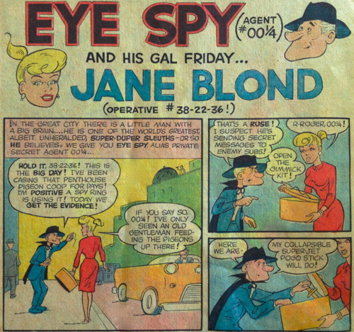 Cold War and Spy Boom influences were also included in the ad pages of Spyman. A brief look through the issues revealed ads for signed photos of David McCallum as Illya Kuryakin (The Man From U.N.C.L.E.), as well as ads for an "electronic computer brain" that included the atomic symbol for some reason. There was also a polaris nuclear submarine toy- because nothing says "fun" like nuclear war! This ad read, "How proud you will be as commander of own POLARIS SUB- the most powerful weapon in the world! What hours of imaginative play and fun as you and your friends dive, surface, maneuver, watch the enemy through your periscope, and fire your nuclear missiles and torpedoes!" There was also an espionage supplement story for younger readers called Eye Spy and His Gal Friday Jane Blond: Agent# 00 1/4, which echoed the paranoia that enemy spies were lurking off-shore in their deadly subs. Stay tuned for more Cold War thrills during Spy Vibe's Comics Week. Enjoy!